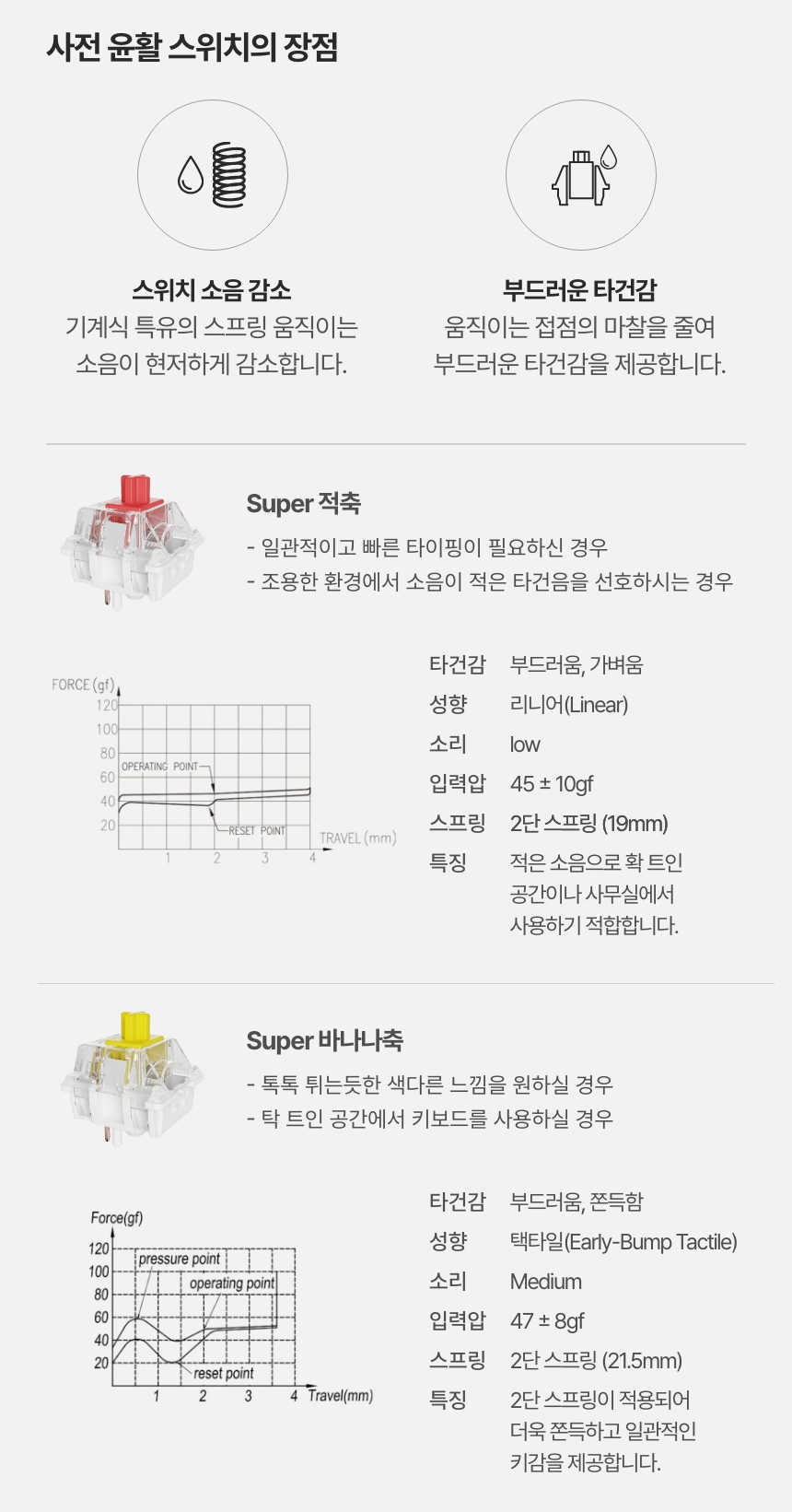 강화된 하우징 : 안정성과 부드러움을 위해 2단 스프링을 적용하여 부드럽고 쫀득한 타이핑 감각을 더하고