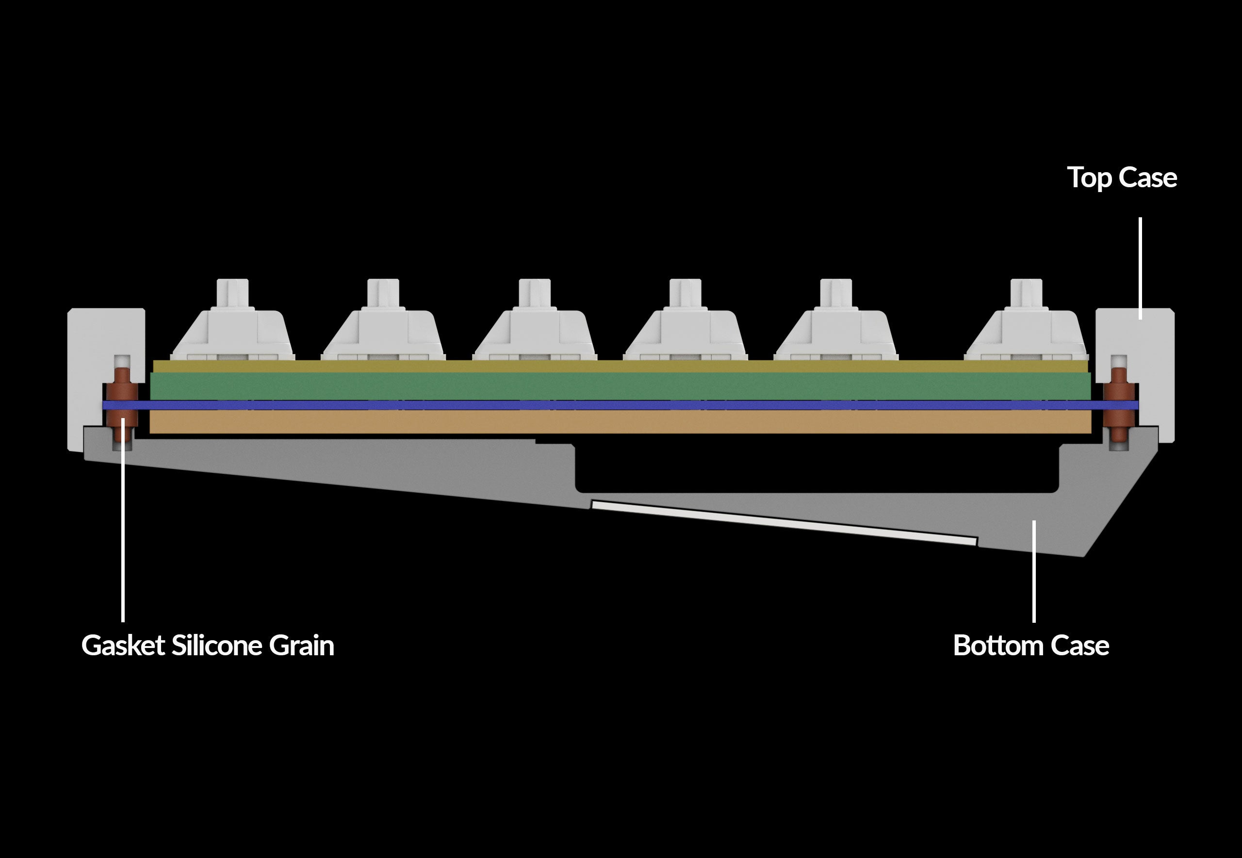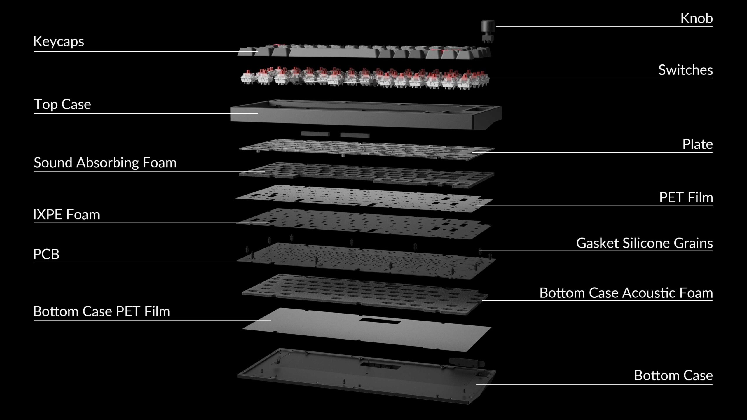 IXPE 및 PET 필름 등 타건감을 살리고 충격 흡수 및 노이즈 감소에 효과적인 흡음재 구성을 조율하여 내부를 빈틈없이 채워 손끝에서 느껴지는 촉각과 귀에서 들리는 청각적인 즐거움을 제공합니다.