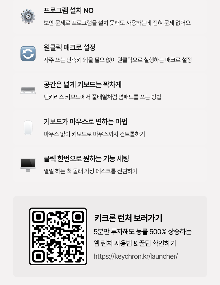 무한 동시 입력이 당연했던 유선을 넘어 무선 블루투스 환경에서도 동시에 누른 키가 모두 입력되는 자유로운 무한 동시입력을 느껴보세요.